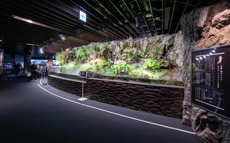 水族館は10のエリアに分かれており、身近な水生生物や世界の海に生息する生物とのつながりを感じ、生命を尊重する心の豊かさを育む人間教育的な側面を大切にしている。日本古来の固有種でもあり、国の特別天然記念物でもある「オオサンショウウオ」は本館の人気生物でもある。他にも、愛らしい「ケープペンギン」や、華麗な泳ぎも見せてくれる「オットセイ」、約30種5,000匹のクラゲが見られる「クラゲワンダー」など、さまざまな水生生物を大都市京都の中心で観賞できるのはうれしい。