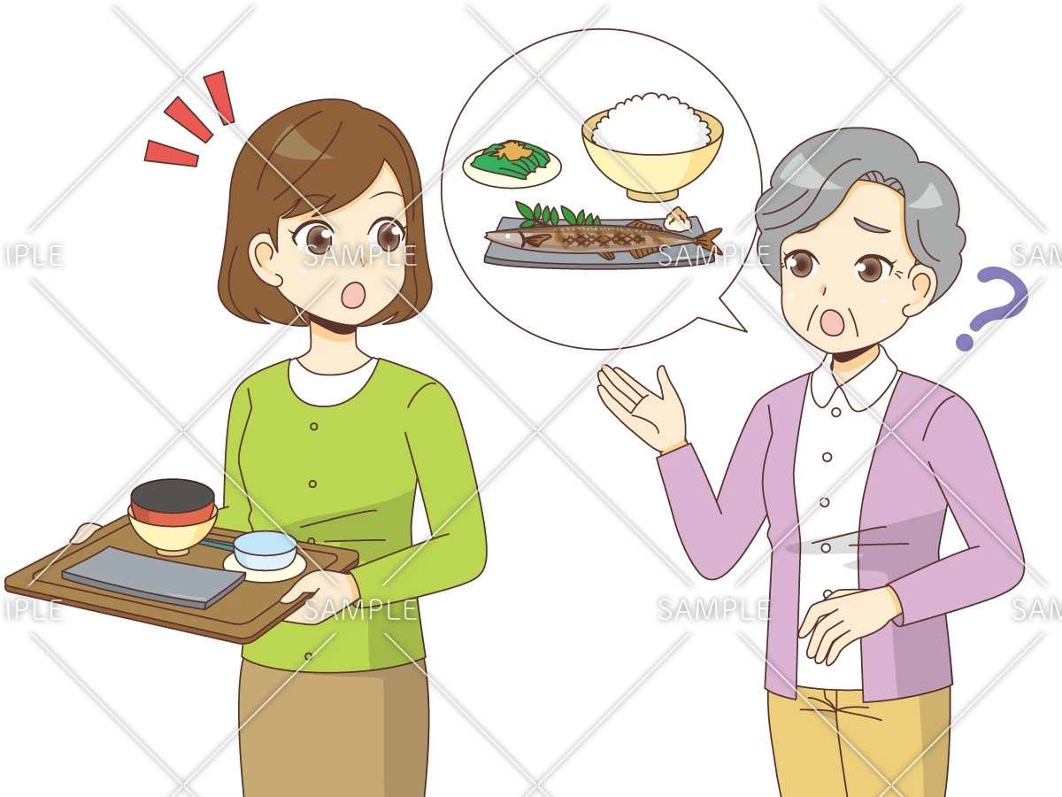 商用利用可能なご飯を食べたことを忘れてしまう女性高齢者(認知症・物忘れ)のイラストです。会員の方ならどなたでも無料でダウンロードできます。老人ホームやデイサービスなどの介護施設をはじめ、さまざまな場面でご活用ください。