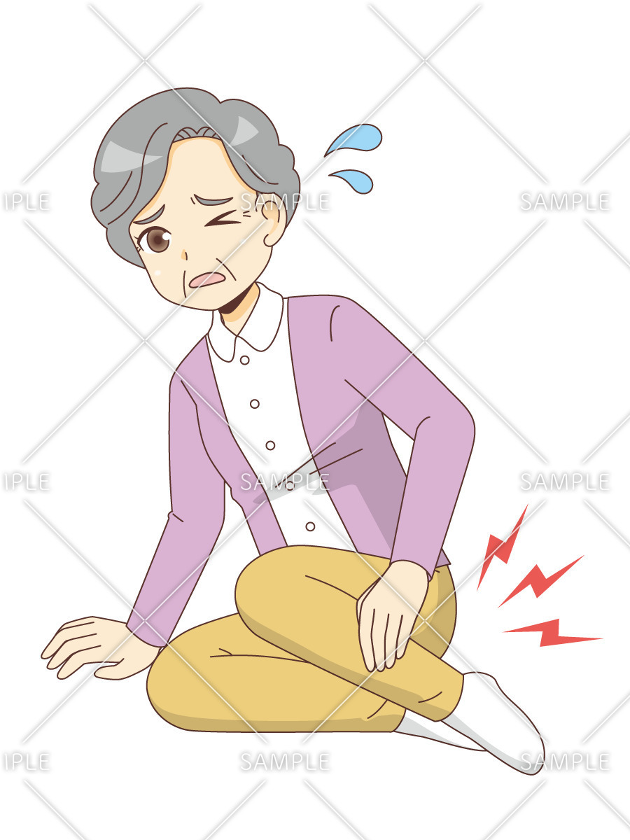商用利用可能な足を痛める女性高齢者(その他高齢者の病気・怪我・事故)のイラストです。会員の方ならどなたでも無料でダウンロードできます。老人ホームやデイサービスなどの介護施設をはじめ、さまざまな場面でご活用ください。