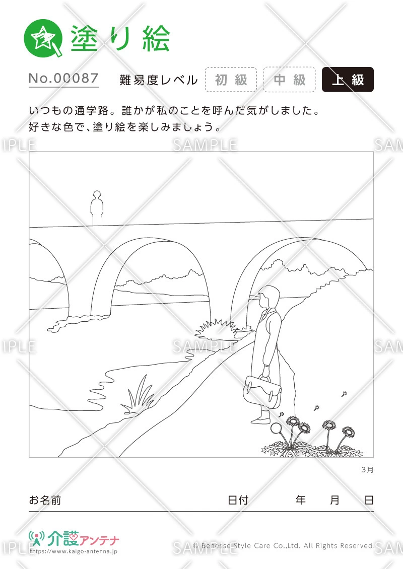 塗り絵「春の通学路」 - No.00087(高齢者向け塗り絵の介護レク素材)