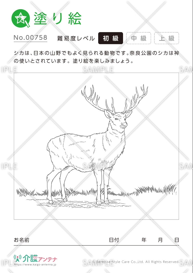 塗り絵「シカ(動物)」 - No.00758(高齢者向け塗り絵の介護レク素材)