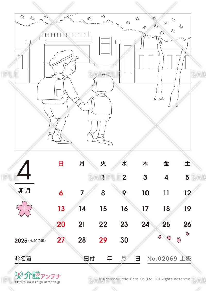 2025年4月の塗り絵カレンダー「桜と迎える新学期」 - No.02069(高齢者向けカレンダー作りの介護レク素材)