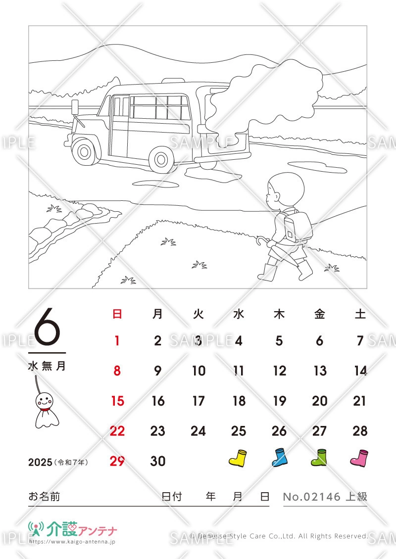 2025年6月の塗り絵カレンダー「ボンネットバス」 - No.02146(高齢者向けカレンダー作りの介護レク素材)
