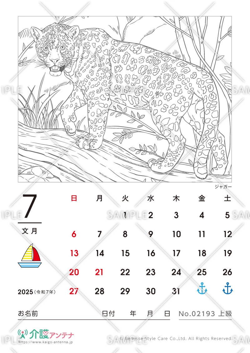 老人ホームやデイサービスセンター、ご自宅などで印刷してお使いいただける無料の高齢者向け介護レク素材 2025年7月の塗り絵カレンダー「ジャガー(動物)」(カレンダー作り・上級)です。