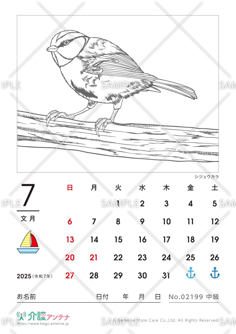 老人ホームやデイサービスセンター、ご自宅などで印刷してお使いいただける無料の高齢者向け介護レク素材 2025年7月の塗り絵カレンダー「シジュウカラ(鳥・動物)」(カレンダー作り・中級)です。