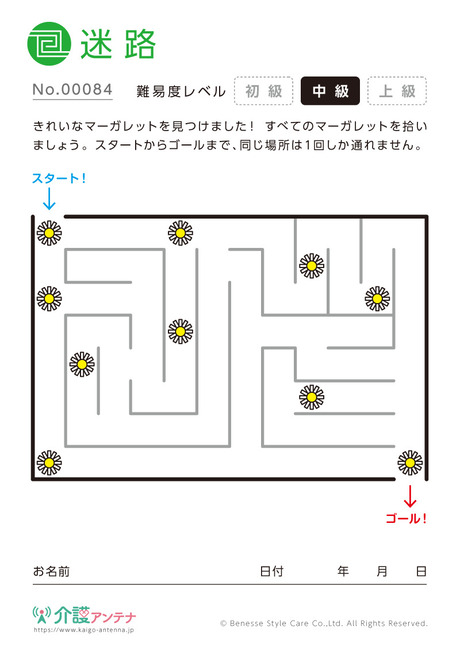 老人ホームやデイサービスセンター、ご自宅などで印刷してお使いいただける無料の高齢者向け介護レク素材(迷路・中級)です。