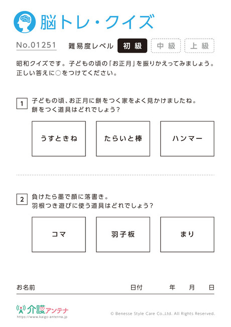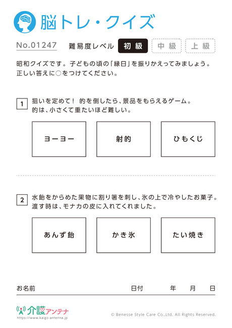 老人ホームやデイサービス事業所などの介護施設やご自宅で印刷して使える介護アンテナオリジナルの脳トレ・クイズです。会員の方ならどなたでも無料でご利用いただけます。