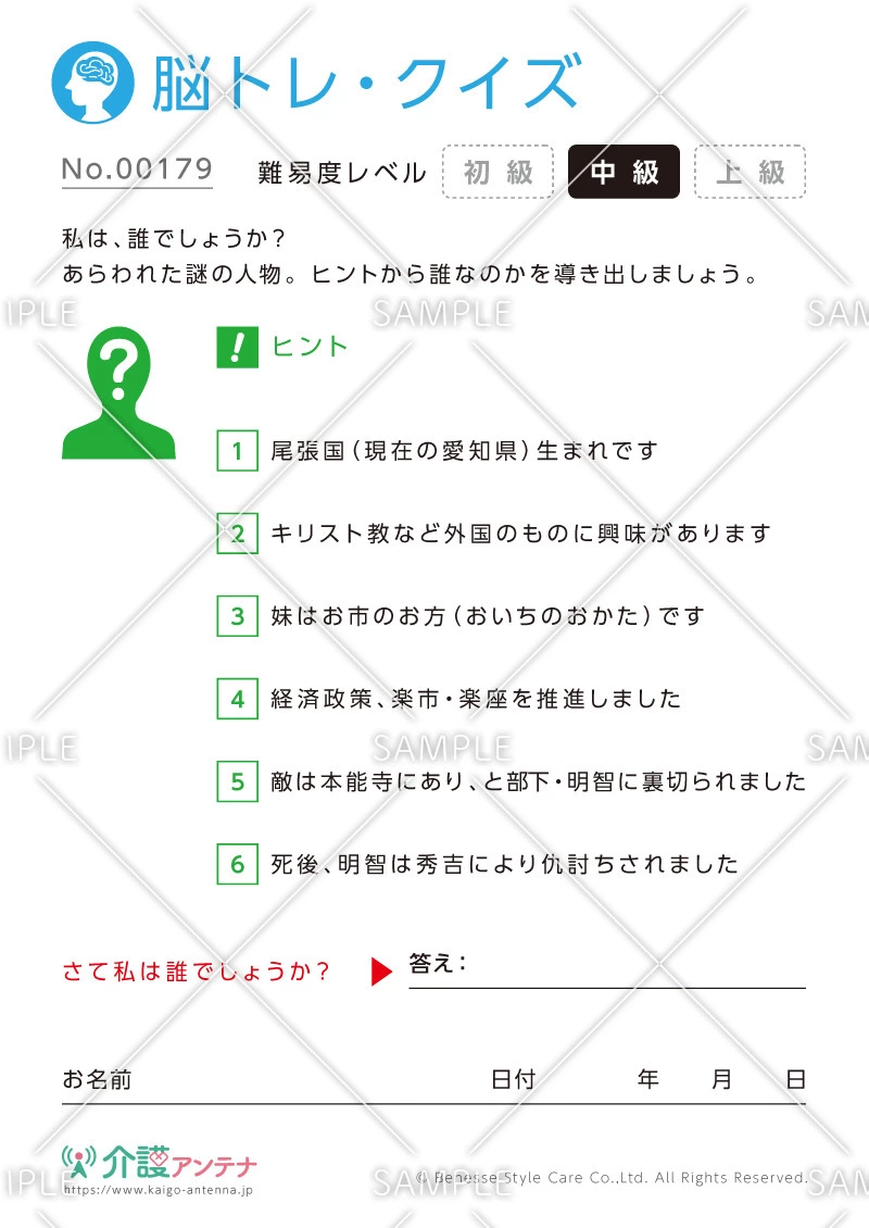 老人ホームやデイサービスセンター、ご自宅などで印刷してお使いいただける無料の高齢者向け介護レク素材(脳トレ・クイズ・中級)です。