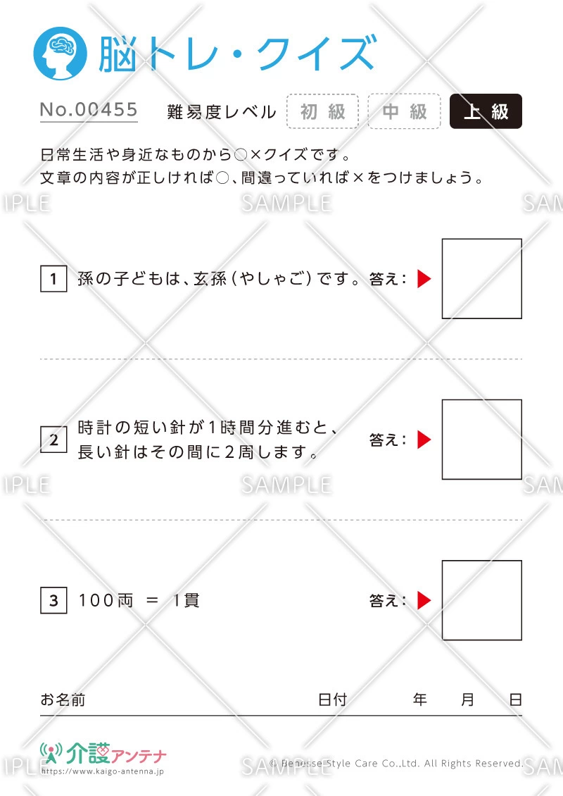 老人ホームやデイサービスセンター、ご自宅などで印刷してお使いいただける無料の高齢者向け介護レク素材(脳トレ・クイズ・上級)です。