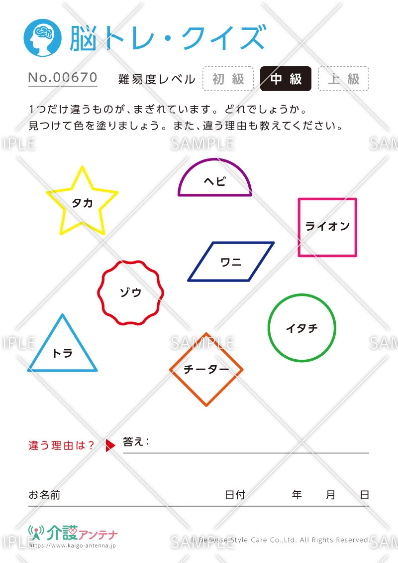 老人ホームやデイサービスセンター、ご自宅などで印刷してお使いいただける無料の高齢者向け介護レク素材(脳トレ・クイズ・中級)です。