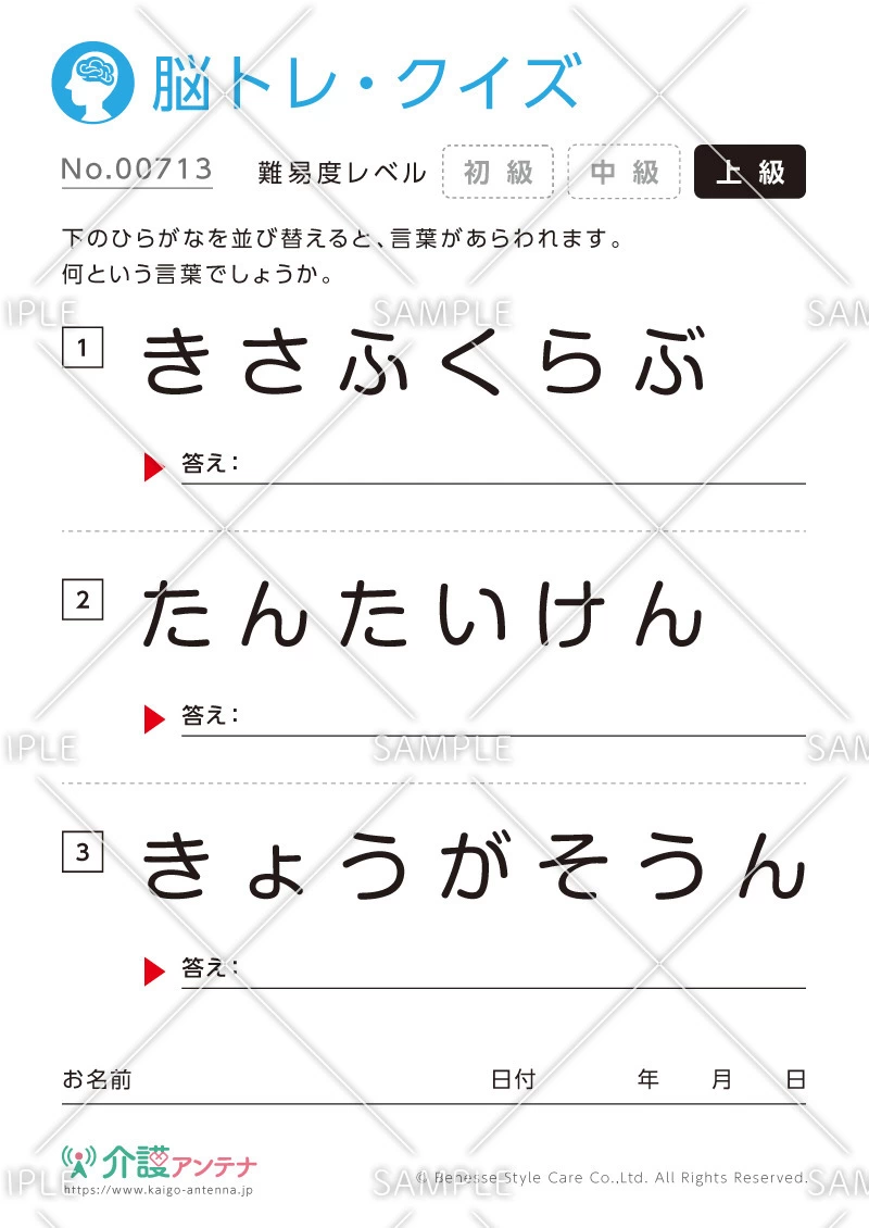 老人ホームやデイサービスセンター、ご自宅などで印刷してお使いいただける無料の高齢者向け介護レク素材(脳トレ・クイズ・上級)です。