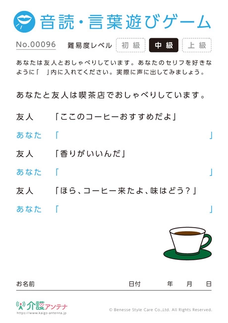 老人ホームやデイサービスセンター、ご自宅などで印刷してお使いいただける無料の高齢者向け介護レク素材(音読・言葉遊びゲーム・中級)です。