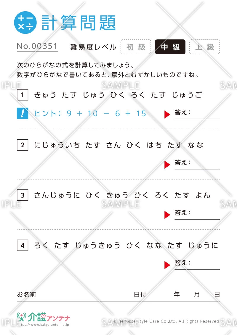 ひらがなの式の計算問題-No.00351(高齢者向け計算問題の介護レク素材)