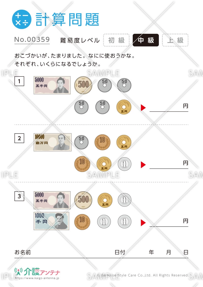 お金の計算問題-No.00359(高齢者向け計算問題の介護レク素材)