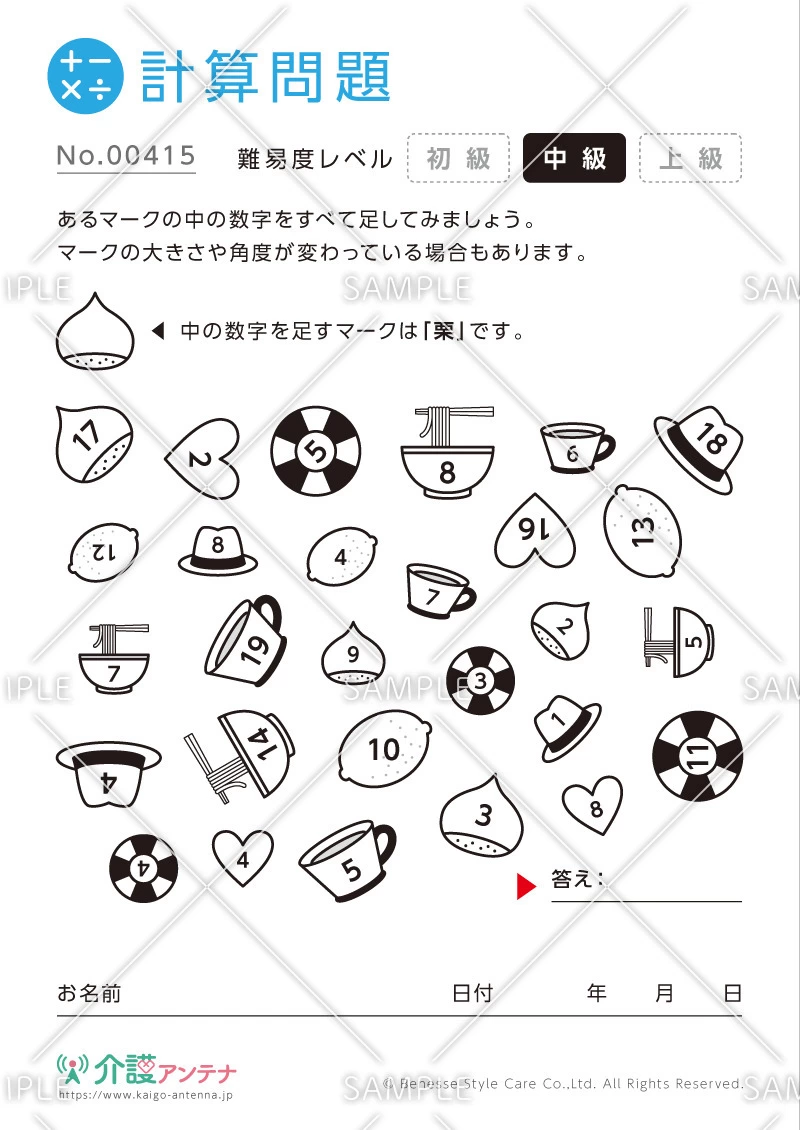 老人ホームやデイサービスセンター、ご自宅などで印刷してお使いいただける無料の高齢者向け介護レク素材(計算問題・中級)です。
