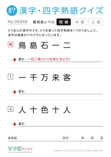 老人ホームやデイサービスセンター、ご自宅などで印刷してお使いいただける無料の高齢者向け介護レク素材(漢字・四字熟語クイズ・上級)です。