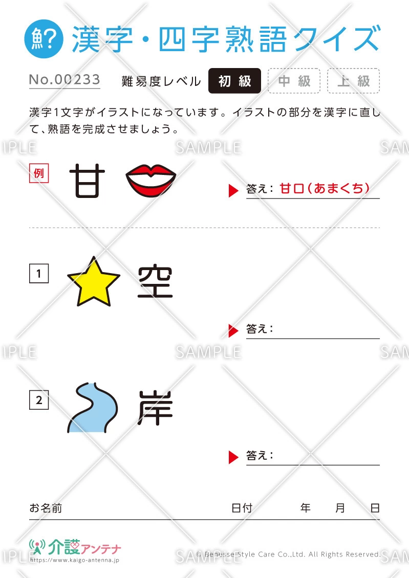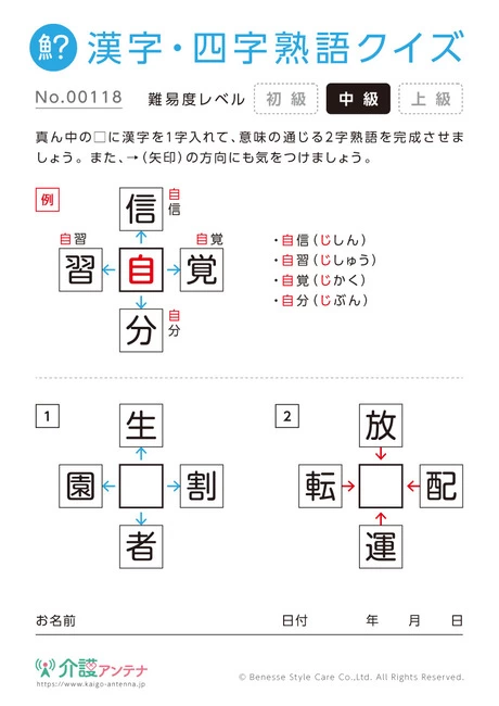 老人ホームやデイサービスセンター、ご自宅などで印刷してお使いいただける無料の高齢者向け介護レク素材(漢字・四字熟語クイズ・初級)です。