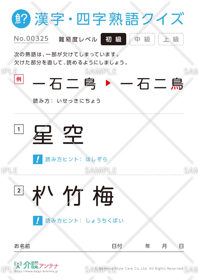 老人ホームやデイサービスセンター、ご自宅などで印刷してお使いいただける無料の高齢者向け介護レク素材(漢字・四字熟語クイズ・初級)です。