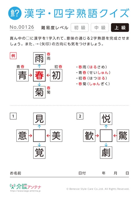 老人ホームやデイサービスセンター、ご自宅などで印刷してお使いいただける無料の高齢者向け介護レク素材(漢字・四字熟語クイズ・上級)です。