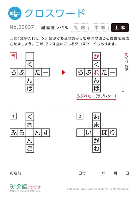 老人ホームやデイサービスセンター、ご自宅などで印刷してお使いいただける無料の高齢者向け介護レク素材(クロスワード・中級)です。