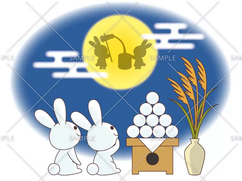 十五夜にお月見をするうさぎを描いたイラストです。うさぎがうさぎの餅つきを見ている、微笑ましいイラストになっています。 お月見イベントのお知らせはもちろん、9月の制作物にかわいらしさをプラスしたいときにも重宝します。夜空のブルーと月のイエローが綺麗なので、挿絵としてもおすすめです。