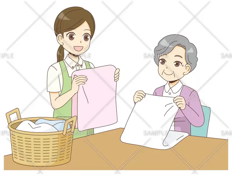 介護スタッフとおばあさんが洗濯物を畳んでいるイラストです。老人ホームやデイサービス、グループホームなどでは、レクリエーションやリハビリの一環として洗濯を取り入ることもあるでしょう。