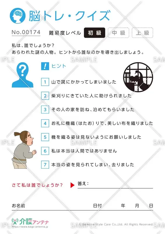 ある人物を説明している文章をヒントに、その人物が誰かを答えるクイズです。イラストもヒントになっています。難易度レベル初級のこちらの問題は、昔話に登場する人物が題材です。昔話が題材になっているので、子どもから高齢者まで楽しむことができます。