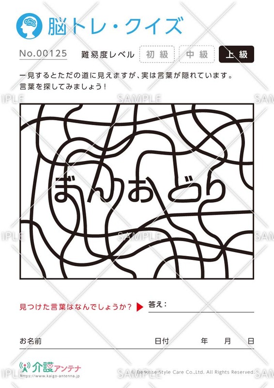 隠れた言葉を探す脳トレ・クイズの「上級」問題です。ぐにゃぐにゃとした道のなかに、5文字のひらがなが隠れています。夏祭りにみんなで音楽にあわせて行う「アレ」といえば……?この行事、もともとはお盆に迎えた死者の魂を送り返すためのものだったそうです。夏祭りの楽しい記憶を思い出しながら、挑戦してみてくださいね。