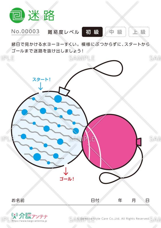 ピンクと水色のヨーヨーが並んでいますが、水色のヨーヨーは、じつは迷路になっています。ヨーヨーの模様にぶつからないよう、ゴールを目指しましょう!かんたんすぎるという方のために、介護アンテナではより難易度が高い迷路素材も用意しています。高齢者の方の好みや状況にあわせてお使いください。