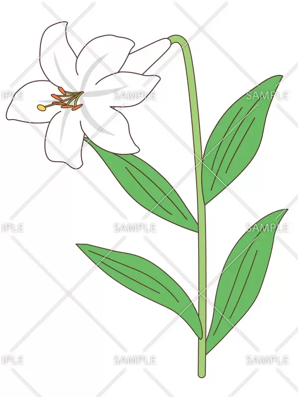 白い百合のイラストです。すらりとした茎に大きな花を咲かせる姿は、どこか高貴な雰囲気が漂います。百合のイラストはていねいな感じを出したいお便りなどにも最適です。空いたスペースにさりげなく添えるだけで印象が変わりますよ。