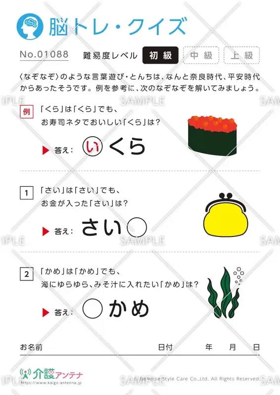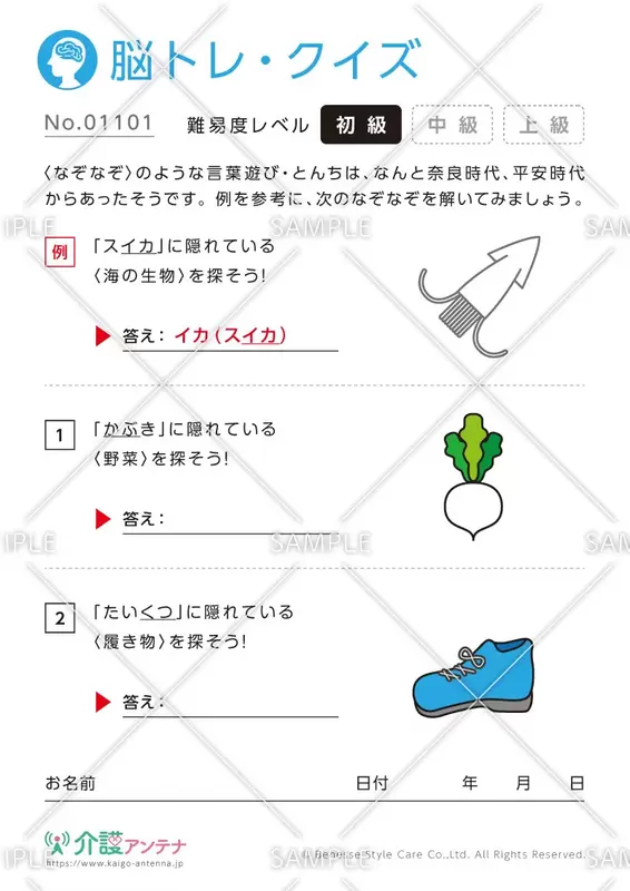 初級はイラストがあるため、どなたも答えやすい問題となっています。問題文を声に出して読み、文字数を数えるときは指を折って数えていくといいでしょう。脳トレをしながら口腔体操や指の体操にもなっておすすめです。