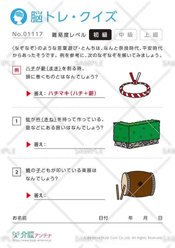 「足が4本、座れる家具、これな~んだ?」という具合に、問題文が示している物の正体を当てるなぞなぞです。初級レベルが簡単な方には、中級や上級レベルの問題をすすめるか、あるいは、ヒントのイラストを隠してチャレンジしてもらってもいいでしょう。