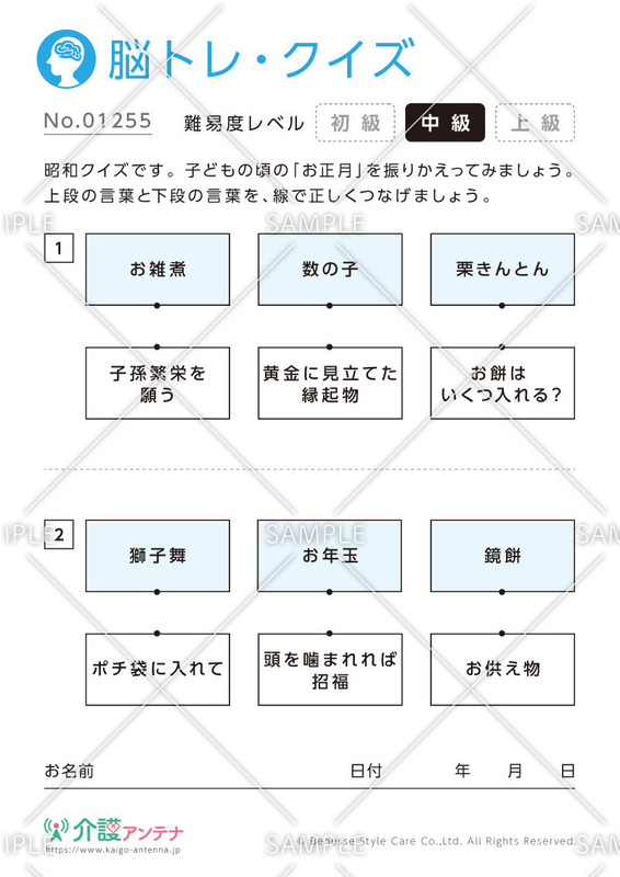 「お正月」をテーマにした昭和クイズです。おせち料理などは地域によって入れる具材や味付けが異なることもあるので、介護施設のレクリエーションなど多くの人が取り組む場合には盛り上がりやすいテーマです。 また問題が初級より難しくなっただけではなく、書かれている言葉に感じが多く使われています。漢字をしっかり読みということも脳トレにつながります。