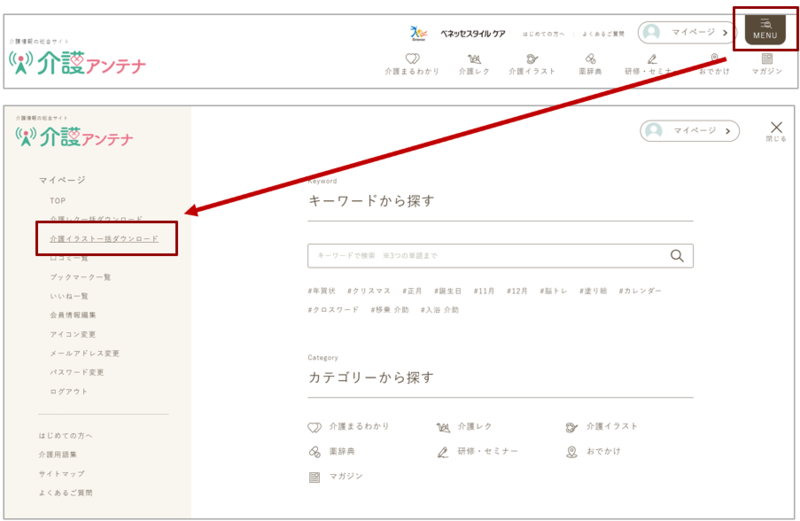 一括ダウンロードページは右上の「MENU」から進むことができます。