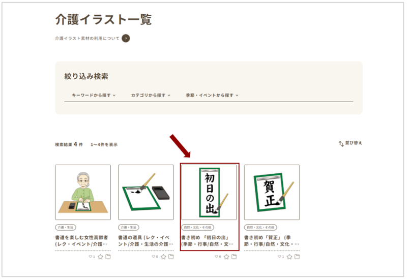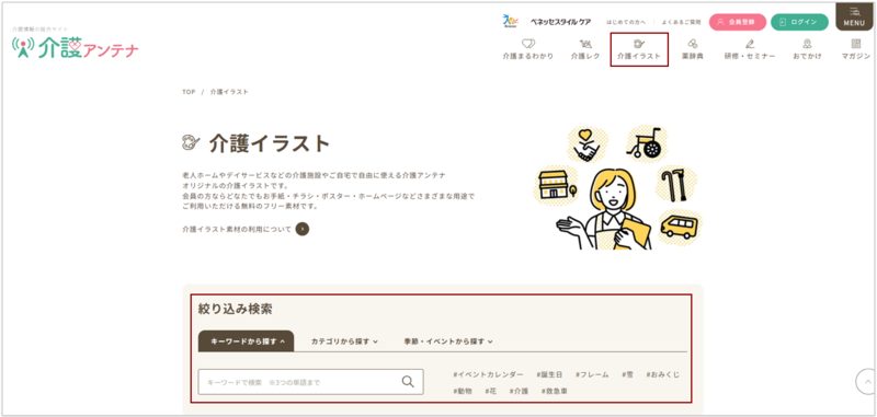 「介護イラスト」を開き、スクロール。絞り込み検索の「キーワードから探す」の入力欄にほしいイラストのキーワードを入力します。