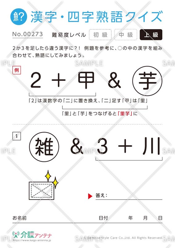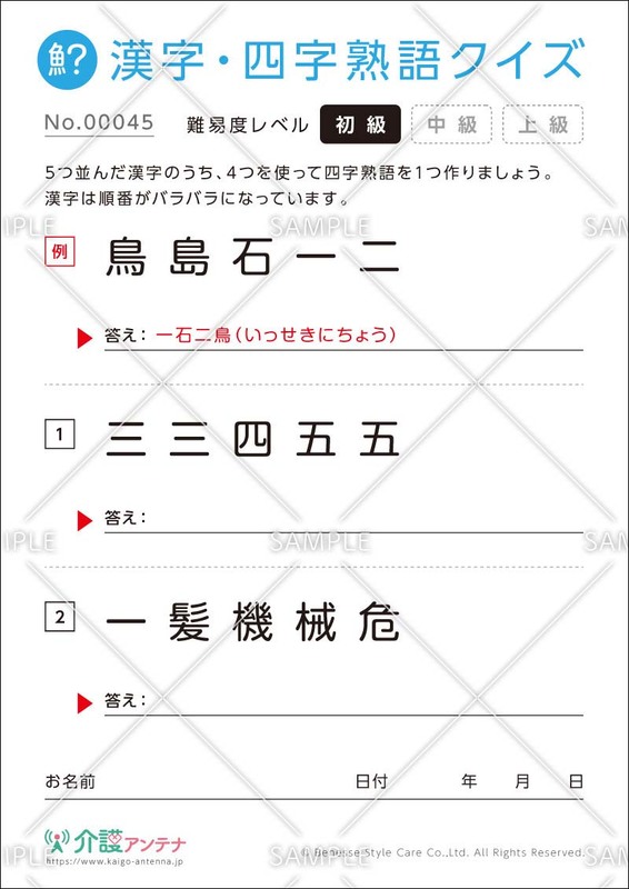 ほかにもまだまだ面白い漢字クイズがたくさんあります。老人ホームやデイサービスのレクリエーションやご自宅での空いた時間などにぜひチャレンジしてみてください。