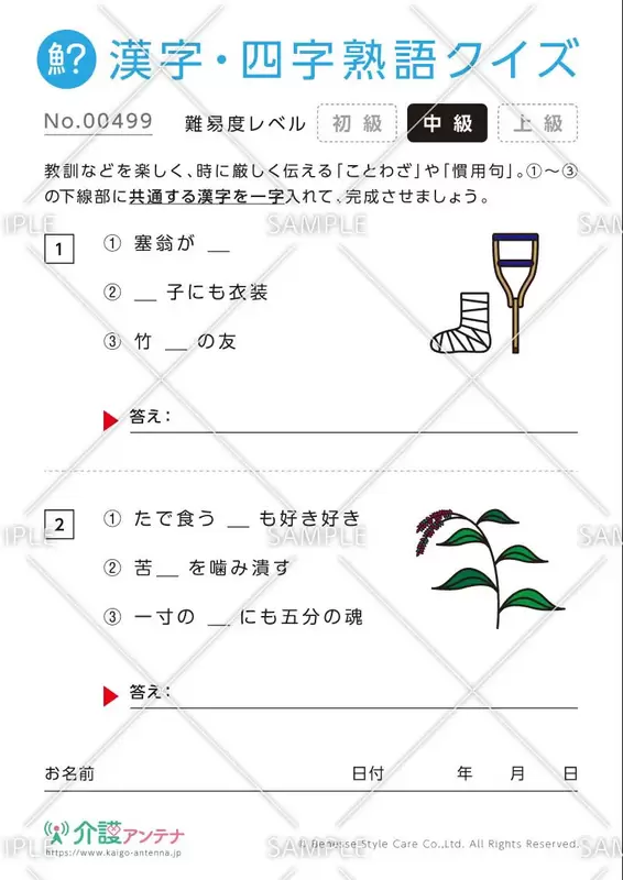 介護レク素材漢字を入れてことわざ・慣用句をつくる漢字・四字熟語クイズ-No.00499